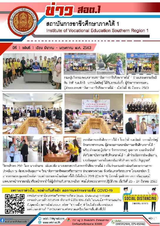 หัวข้อข่าว : จดหมาข่าว สถาบันการอาชีวศึกษาภาคใต้ 1 ปีที่ 1 ฉบับที่ 1 เดือน มีนาคม - พฤษภาคม 2563 วันที่ : 4 มิ.ย. 2563 รายละเอียด : ด้วยสถาบันการอาชีวศึกษาภาคใต้ 1 ได้จัดทำจดหมายข่าวประชาสัมพันธ์ ปีที่ 1 ฉบับที่ 1 เดือน มีนาคม - พฤษภาคม 2563 เพื่อเป็นการเผยแพร่ประชาสัมพันธ์ข้อมูลข่าวสารการดำเนินงานและกิจกรรมต่างๆ ของสถาบันการอาชีวศึกษาภาคใต้ 1 |