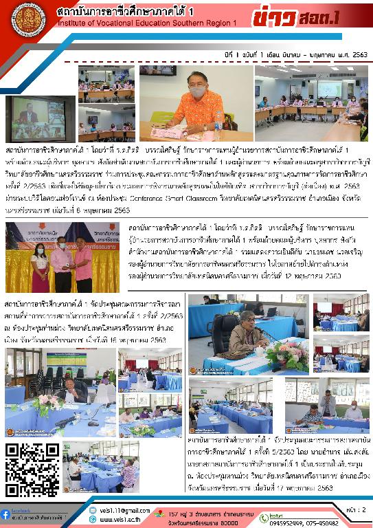 การประชุมสรุปผลจากการประชุมคณะกรรมการพิจาณาที่ทำการถาวรฯ และการประชุมคณะกรรมการสภาสถาบันฯ เพื่อสู่แนวปฏิบัติต่อไป วันที่ : 18 พ.ค. 2563 รายละเอียด : วันจันทร์ที่ 18 พฤษภาคม 2563 สถาบันการอาชีวศึกษาภาคใต้ 1 โดย ว่าที่ ร.ต.กิตติ บรรณโศภิษฐ์ รักษาราชการแทน ผู้อำนวยการสถาบันการอาชีวศึกษาภาคใต้ 1 ได้ประชุมบุคลากรของสถาบันฯ ในการสรุปผลจา...เพิ่มเติม