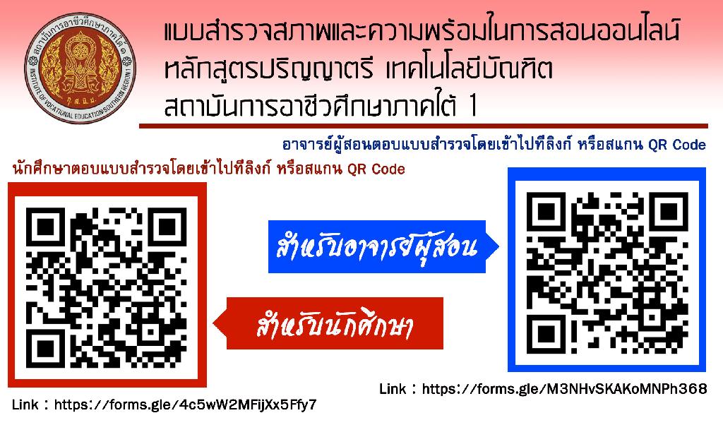 แบบสำรวจสภาพและความพร้อมในการเรียนออนไลน์ หลักสูตรปริญญาตรี เทคโนโลยีบัณฑิตสถาบันการอาชีวศึกษาภาคใต้ 1 วันที่ : 18 พ.ค. 2563 รายละเอียด : การสำรวจสภาพและความพร้อม สำหรับการจัดการเรียนการสอนแบบออน์ไลน์ หลักสูตรปริญญาตรี เทคโนโลยีบัญฑิต สถาบันการอาชีวศึกษาภาคใต้ 1 สำหรับนักศึกษา และอาจารย์ผู้สอน สามรถเข้าตอบแบบสอบถามได้ที่ลิงก์(ด้านล...เพิ่มเติม